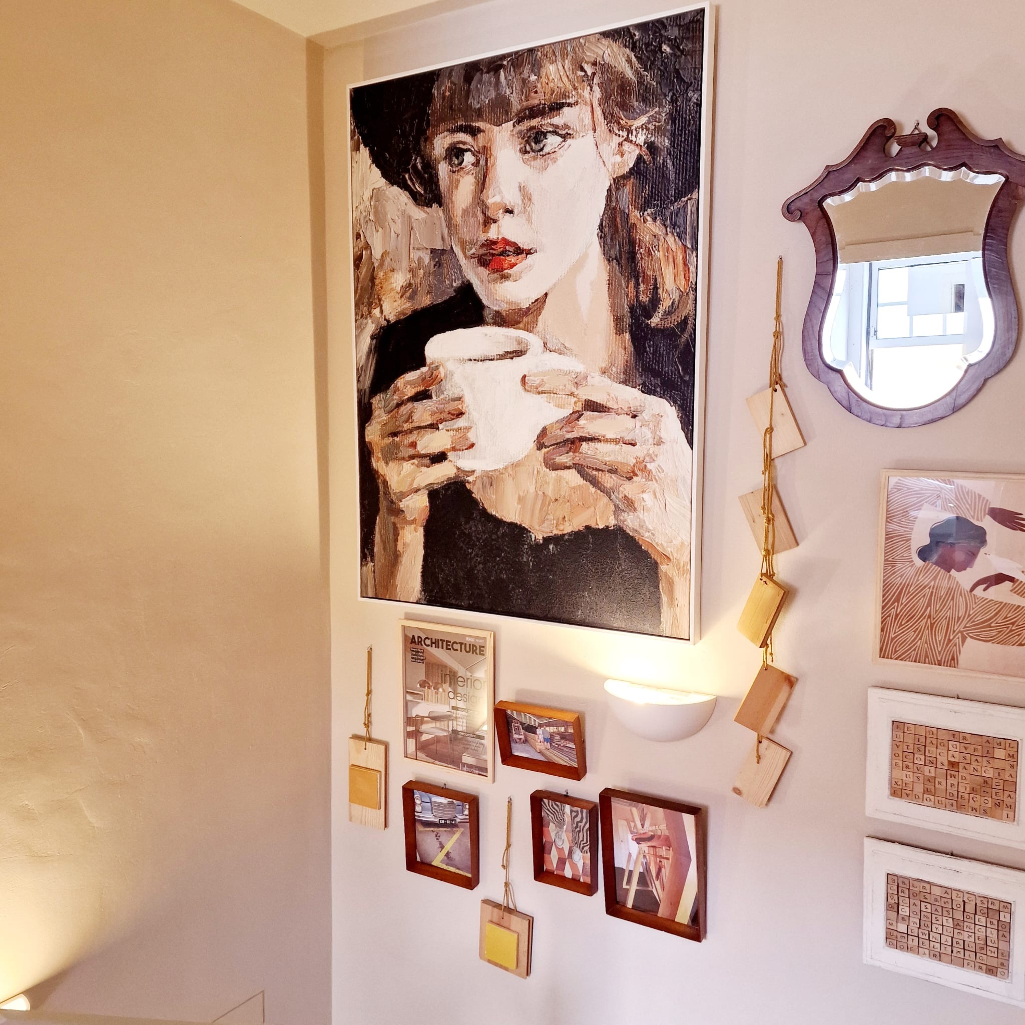 The first floor also includes a communal area designed for meal preparation, where guests can gather and share the local cuisine. The decor emphasizes bespoke tapestries that adorn the walls in warm, neutral tones, thoughtfully complementing the historic elements of the space. Among these is a centuries-old tile panel that surrounds the main entrance, leading up a staircase of stone slabs, harmoniously coexisting with the historical pieces that complete the ambiance.